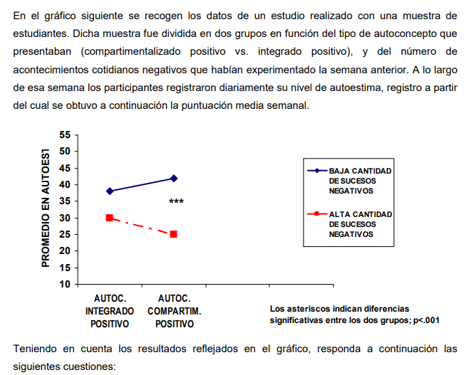 Los resultados del estudio ponen de manifiesto que, en el caso de las personas que tenían un autoconcepto integrado positivo, el hecho de experimentar una cantidad alta o baja de sucesos negativos afectaba al nivel promedio de su autoestima, ya que las diferencias en esta variable entre los dos grupos no fueron significativas. Sin embargo, en el grupo de personas con un autoconcepto compartimentalizado positivo, sí se constató que su nivel de autoestima era significativamente más bajo cuando habían experimentado una alta cantidad de sucesos negativos, en comparación con el grupo que, teniendo el mismo tipo de autoconcepto, informaba haber tenido una cantidad baja de sucesos negativos. Por otro lado, se puede observar que cuando el número de sucesos negativos experimentados era bajo, el nivel de autoestima mostrado por los individuos con un autoconcepto compartimentalizado era ligeramente superior al de los individuos con el autoconcepto integrado, aunque las diferencias entre estos dos grupos fueron significativas. De igual modo, cuando el número de sucesos negativos era alto, las personas con un autoconcepto integrado mostraban un nivel de autoestima ligeramente superior al de las personas con un autoconcepto compartimentalizado, si bien esta diferencia tampoco resultó ser significativa.